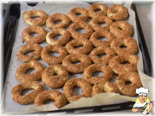 Tüm malzemeler karıştırılarak yoğrulur. Simit şekli verilir. Yumurta akı ve susama bulanarak fırında pişirilir.