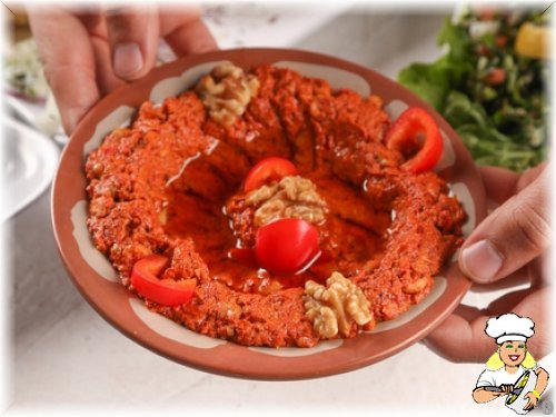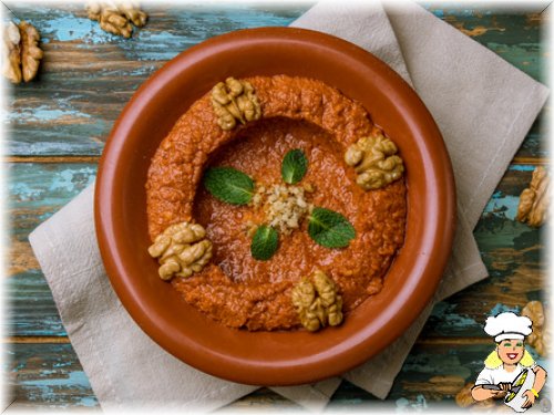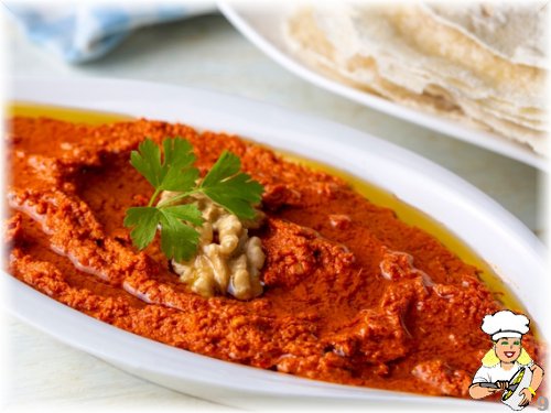 Biberleri közleyin, bir kağıt torbaya koyup 10 dakika bekletin, çıkartıp zarını soyun, sapını ve içindeki tohumlarını atın, elinizle çatalla veya mutfak robotunda ezerek püre haline getirin. Sarmısak ve soğanın kabuklarını ayıklayın, ince ince çentin. Bir kapta ezilmiş biberi, sarmısağı, soğanı, biber salçasını, öğütülmüş kızarmış ekmeği ve cevizi iyice karıştırın. Limon suyu ve nar ekşisini ilave edin, tekrar karıştırın. Yoğurt, kimyon ve tuzu katarak tadını ayarlayın. En sonunda karıştırmaya devam ederek zeytinyağını yavaşça ilave edin. Bir gün önceden hazırlarsanız daha keskin bir lezzet ve koku elde edebilirsiniz. Kızarmış ekmek yerine sıcak suda bekletilmiş bulgur da kullanabilirsiniz.