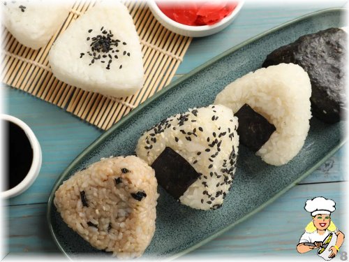 Nori yapraklarından birisinin yarısını ufalayın. Susam ve çörek otu ile karıştırın. Susam, yosun ve çörekotu karışımını ayırdığınız pirince ekleyin ve karıştırın. Yaklaşık 160 gr haşlanmış pirinç için 10 gr karışım kullanın. İyice karıştırdıktan sonra yine ellerinizi tuzlu suya batırıp üçgen pirinç toplarınızı oluşturmaya başlayın.