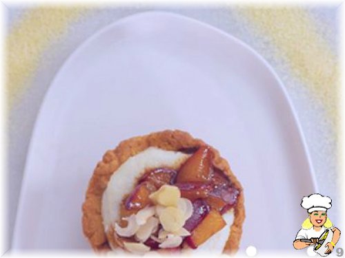 Tartlarımızın içerisine hazırladığımız muhallebili ve şeftalili karışımı ilave edip, file badem servis ediyoruz.